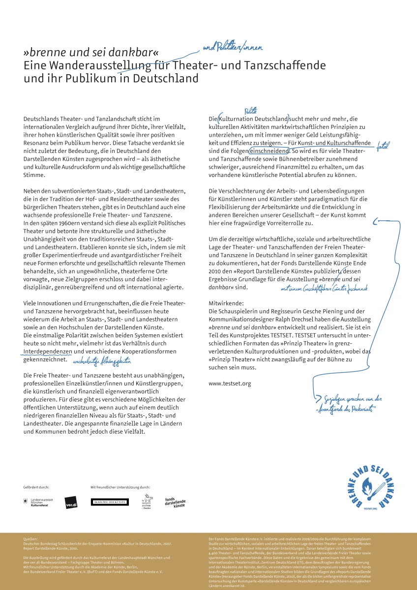 Um die derzeitige wirtschaftliche, soziale und arbeitsrechtliche Lage der Freien Theater und Tanzschaffenden in Deutschland in seiner ganzen Komplexität zu dokumentieren, hat der Fonds Darstellende Künste Ende 2010 den „Report Darstellende Künste“ publiziert (Herausgeber Günter Jeschonnek). Die Ergebnisse des „Report Darstellende Künste“ sind Grundlage für die Ausstellung „brenne und sei dankbar“.