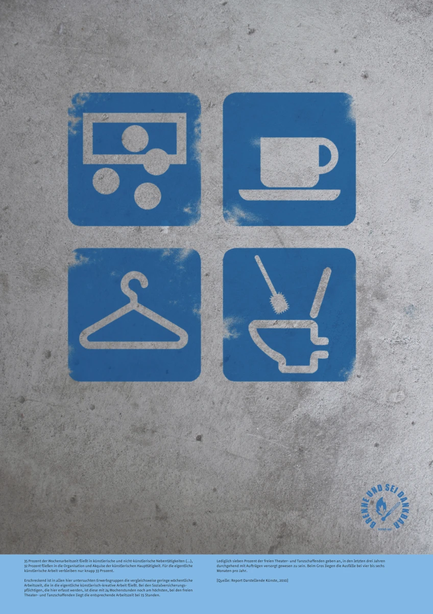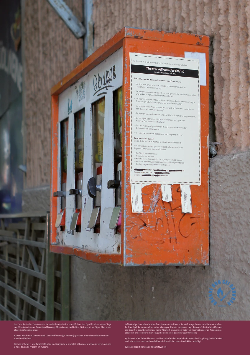 Mit Witz, Ironie und Hintersinn hat das Kuratorenduo die Arbeitsrealität der Freien (Theaterschaffenden) auf zwölf Plakaten so anschaulich wie bezeichnend auf den Punkt gebracht.