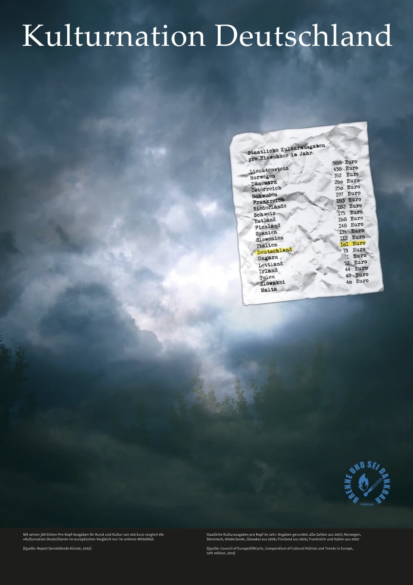 Auch in der Kulturnation Deutschland herrschen die marktwirtschaftlichen Prinzipien mehr und mehr über die kulturellen Aktivitäten. Ziel ist es, mit immer weniger Geld Leistungsfähigkeit und Effizienz zu steigern. Für Kunst- und Kulturschaffende sind die Folgen fatal. Die kontinuierliche Verschlechterung der Arbeits- und Lebensbedingungen für Künstlerinnen und Künstler ist beispielhaft für die Flexibilisierung der Arbeitsmärkte und die Entwicklung in anderen Bereichen unserer Gesellschaft – der Kunst kommt hier eine fragwürdige Vorreiterrolle zu.