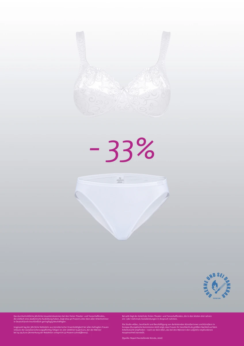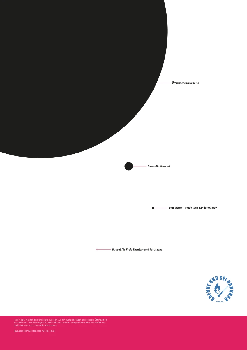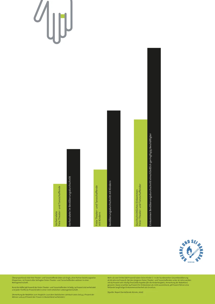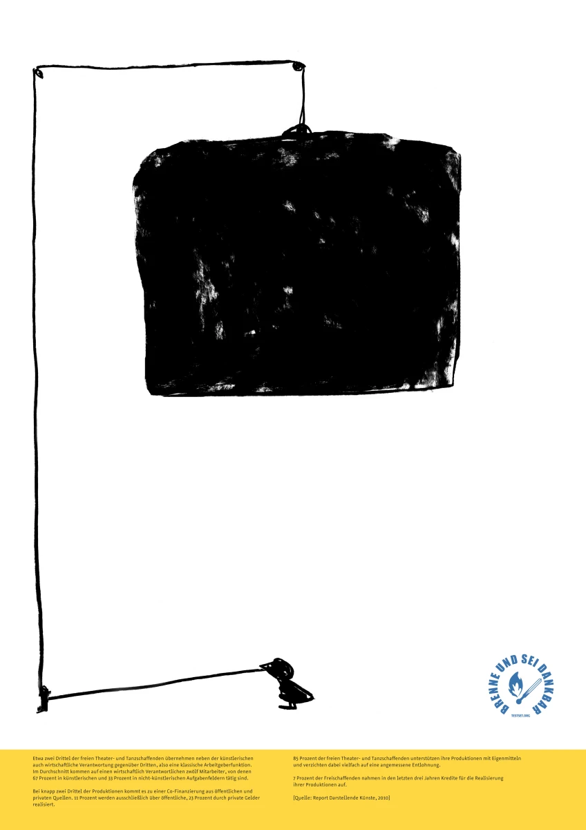 Es sind schockierende Erkenntnisse, die die Wanderausstellung „brenne und sei dankbar“ mit nur zwölf Postern auslöst. (…) Selbst wer die Studie, auf der sie aufbaut – Günter Jeschonneks „Report Darstellende Künste“ aus dem Jahr 2010 – schon einmal in den Händen hatte, wird erstaunt sein.